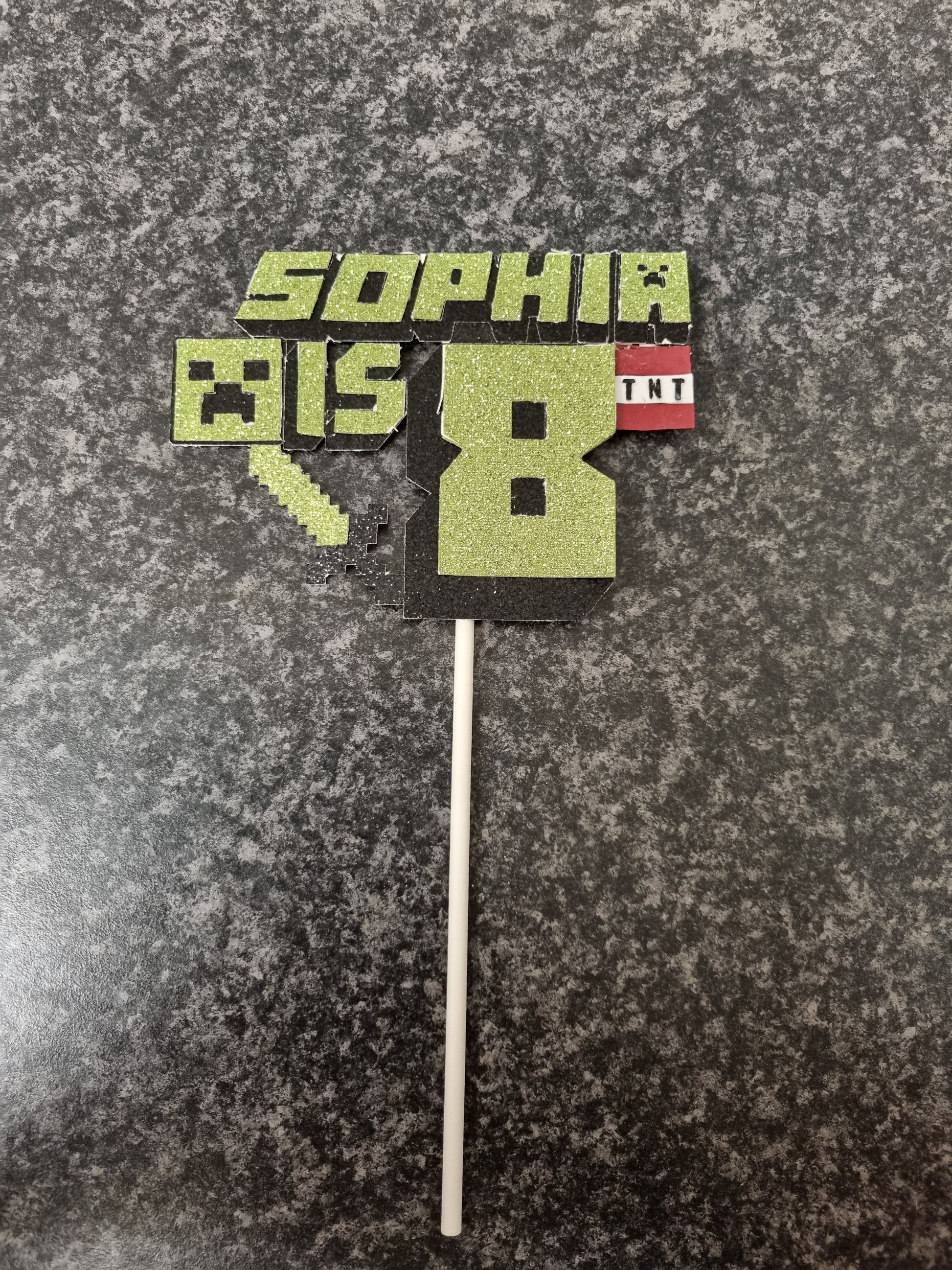 This listing is for 1 x Pixel Font Gaming Style Glitter Cake Topper, in GREEN, SILVER OR PINK text with black backing, as shown in photos.