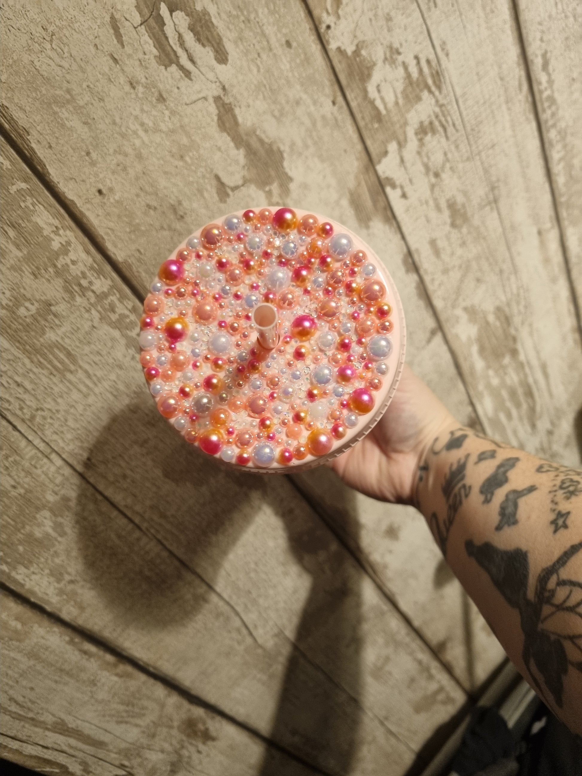 Baby Pink 24oz Cold Cup, Decorated With Pretty In Pink Rhinestones, Pregnant Lady On One Side & Mama EST. 2024 On The Other.