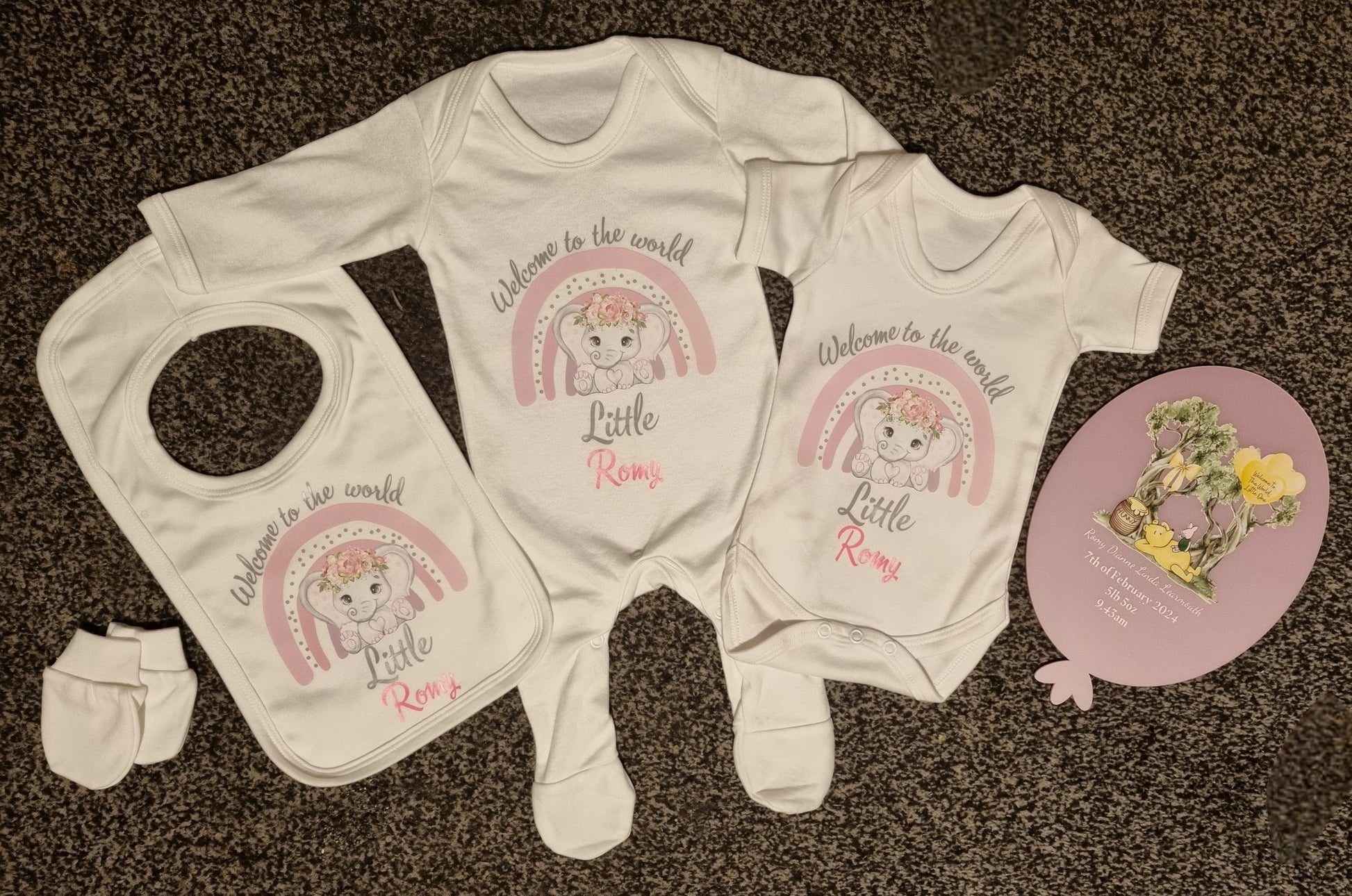 Baby Set Includes - Sleepsuit, Vest, Pull Over Bib & Scratch Mits - Personalised With Welcome To The World.